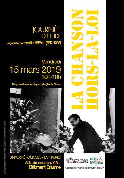Après un premier volet sur la chanson de lutte (journée d'études "Bella ciao", UT2J, 22 mai 2017), ce deuxième volet de la thématique : "opera contro : la chanson", sera consacré à la chanson "hors la loi" . La journée prévoit deux sections : la matinée sur les chansons qui parlent des hors-la-loi : chants de prison, chansons de la pègre, chansons sur la mafia entre autres ; l'aprèsmidi sera centrée sur l'étude de la chanson elle-même "hors-la-loi" : chants féministes ou anarchistes et chansons censurées pour des raisons "morales" ou politiques.
