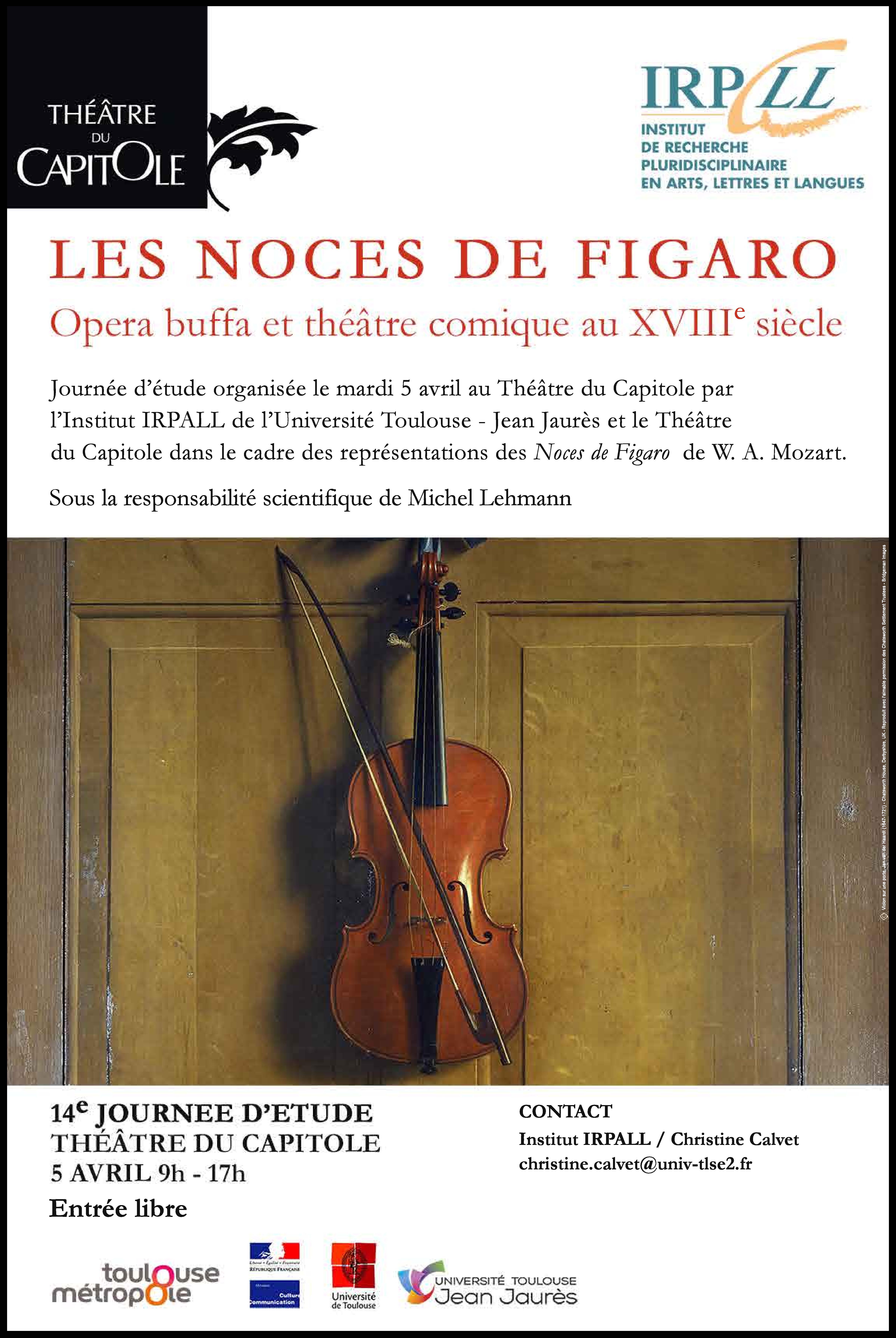 Cette 14e Journée d'étude, organisée dans le cadre du partenariat entre le Théâtre du Capitole et l'Institut IRPALL et consacrée aux Noces de Figaro d'après Le Mariage de Figaro de Beaumarchais, offre l’occasion d'établir à l'échelle européenne un état des lieux des pratiques en vigueur dans la production du théâtre comique du XVIIIe siècle et de leurs influences sur l'opera buffa. Elle tentera aussi de mieux éclairer les intentions du couple Mozart – da Ponte par rapport au poids des conventions et de leur possible détournement.