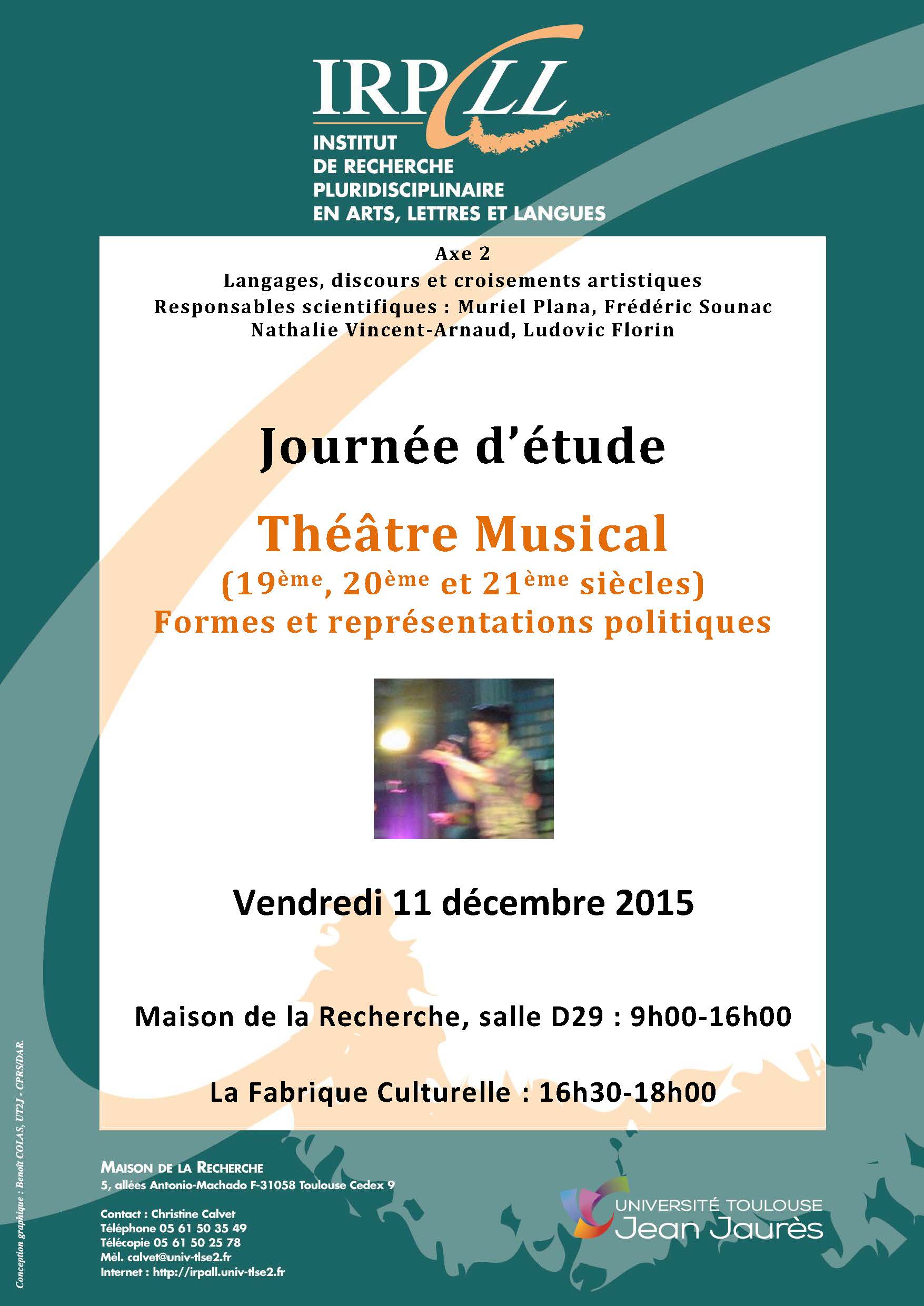 La journée d'études IRPALL "Théâtre musical: formes et interrogations politiques" nous permettra de nous demander en quoi cet art indéterminé, hybride, voire dialogique, qui articule de façon spécifique au XXe et au XXIe siècle le théâtre et la musique, en s'opposant aux dispositifs traditionnels ou dominants de création et de réception du théâtre, de la musique, de l'opéra ou encore de la comédie musicale, travaille ses formes, comme les représentations sociales dont il s'empare ou qu'il invente, sur un mode qualifiable de politique.