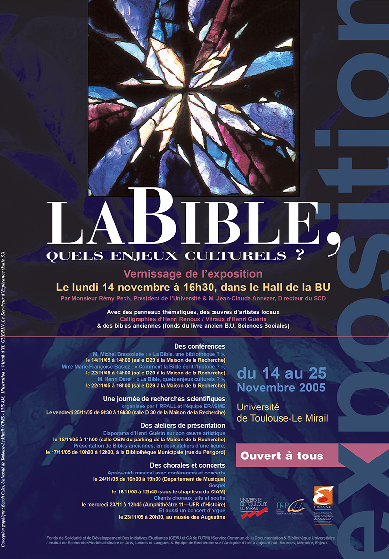 De même qu’une oeuvre d’art sollicite plusieurs interprétations dont les effets cumulés veulent à la fois rendre justice à l’oeuvre et contribuer à sa vie ultérieure, de même, les manières dont la communauté interprétante propose une lecture et une interprétation historiques contribuent à la pluridimensionnalité du texte. ” Paul Ricoeur et Abdré La Cocque, Penser la Bible, p 13, Seul 1998 Ont participé à la réalisation de cette exposition : Coordination : Serge Delsaut Sociologie : Benoît Petit, Yankel Abergel, Anaelle Ingold Histoire : Sandra Bourguet, Philippe Foro, Pierre Cordier, Erwin Julien, Owen Chadwick Géographie : Aurélien Baldet, Pascale Bonef Bibles anciennes : Alexandre Bereczki, Adela Bereczki Littérature : Amandine Bombail, Jean-Christophe Cabanis, Claire Pascal, Michel Bressolette, Isabelle Hoarau Musique : Jean-Christophe Maillard, Mylène Dubiau Calligraphie : Riccardo Di Giuseppe Calligraphie arabe : Habib Samrakandi, Abdellatif El-Yagoubi Exposition appuyée par les groupes de recherche IRPAL (dirigé par Jean-Louis Breteau) et ERASME (dirigé par Pascal Payen)