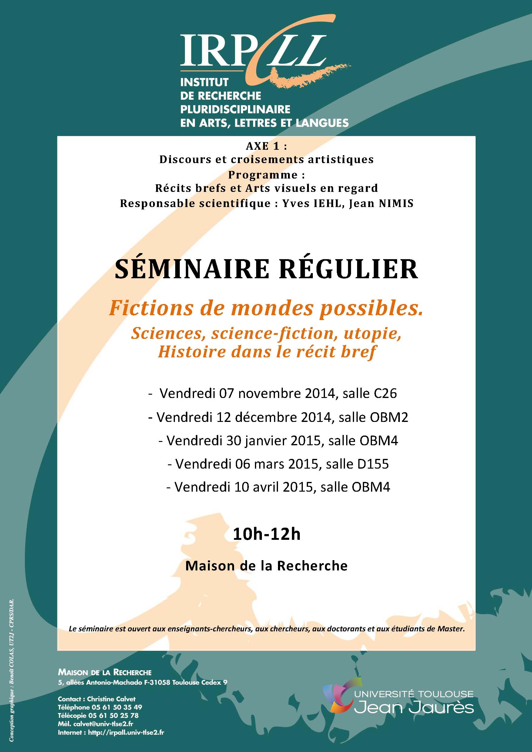L’enjeu de ce séminaire est précisément d’explorer, en adoptant notamment des angles d’approche variés, ce phénomène d’enrichissement et de réinvention permanente qui ne remet pas en cause les caractéristiques d’une écriture fondée sur un principe d’économie mais montre au contraire comment celle-ci se diversifie. Un principe du séminaire a longtemps été d’envisager le « genre » narratif bref dans une optique très souple qui permet d’éviter l’écueil que constituerait une réflexion générique étroite et refermée sur elle-même, mais sans jamais perdre de vue la spécificité d’une écriture qui perdure précisément et paradoxalement à travers les multiples transformations du récit bref. Une démarche essentielle qui confère toute son originalité à une réflexion générique qui, dans le champ des études littéraires, a peut-être perdu en soi une part de son actualité, est en outre de comparer et de croiser la diversité des points de vue et approches des aires géolinguistiques européennes dans une pratique de l’analyse des textes qui s’appuie aussi bien sur des aspects thématiques que sur des perspectives narratologiques, stylistiques et (inter)sémiotiques. Cette perspective comparative, appelée à s’enrichir de regards émanant d’autres espaces culturels (Amériques du Nord et Latine, Asie, Australie), s’est naturellement orientée ces dernières années vers le terrain de l’intermédialité qui est devenu un objet privilégié de réflexion. C’est ainsi dans la convergence et au point de contact de la littérature et des arts visuels, du texte et de l’image, du lisible et du visible qu’ont été en particulier exploré la dynamique propre au récit bref et sa propension à l’auto-régénération et à l’hybridation créatrice. La thématique vers laquelle s’oriente actuellement le séminaire, « sciences, science-fiction, utopies, histoire », est le résultat d’un recentrage sur un domaine littéraire ou se croisent de multiples influences, où notamment la paralittérature rejoint la réflexion philosophique, et où l’anticipation est proche du discours utopique. Il s’agit d’un carrefour ouvert où la créativité inhérente au récit bref ne peut que donner toute sa mesure. L’enjeu est d’explorer et de retracer la façon dont des données ou événements culturels – tels les avancées scientifiques, découvertes, idéologies, utopies ou uchronies – ont non seulement nourri l’inspiration des auteurs mais renouvelé, par leur retentissement dans l’imaginaire collectif, un mode spécifique d’écriture et stimulé l’évolution d’un genre.